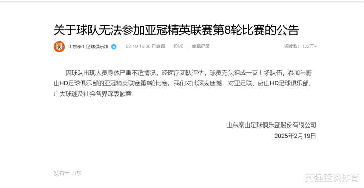 大家好!我是黄强歪谈体育,专注体育,今天与大家聊一下山东泰山退出亚冠这个话题。各位球迷朋友们,今天与大家聊一下山东泰山突然宣布退赛这个话题。可能很多球迷无法接受这个现实,毕竟他们是几支中超球队在亚冠表现最好的球队,十分有机会出线,如今退赛,对球队有哪些影响?